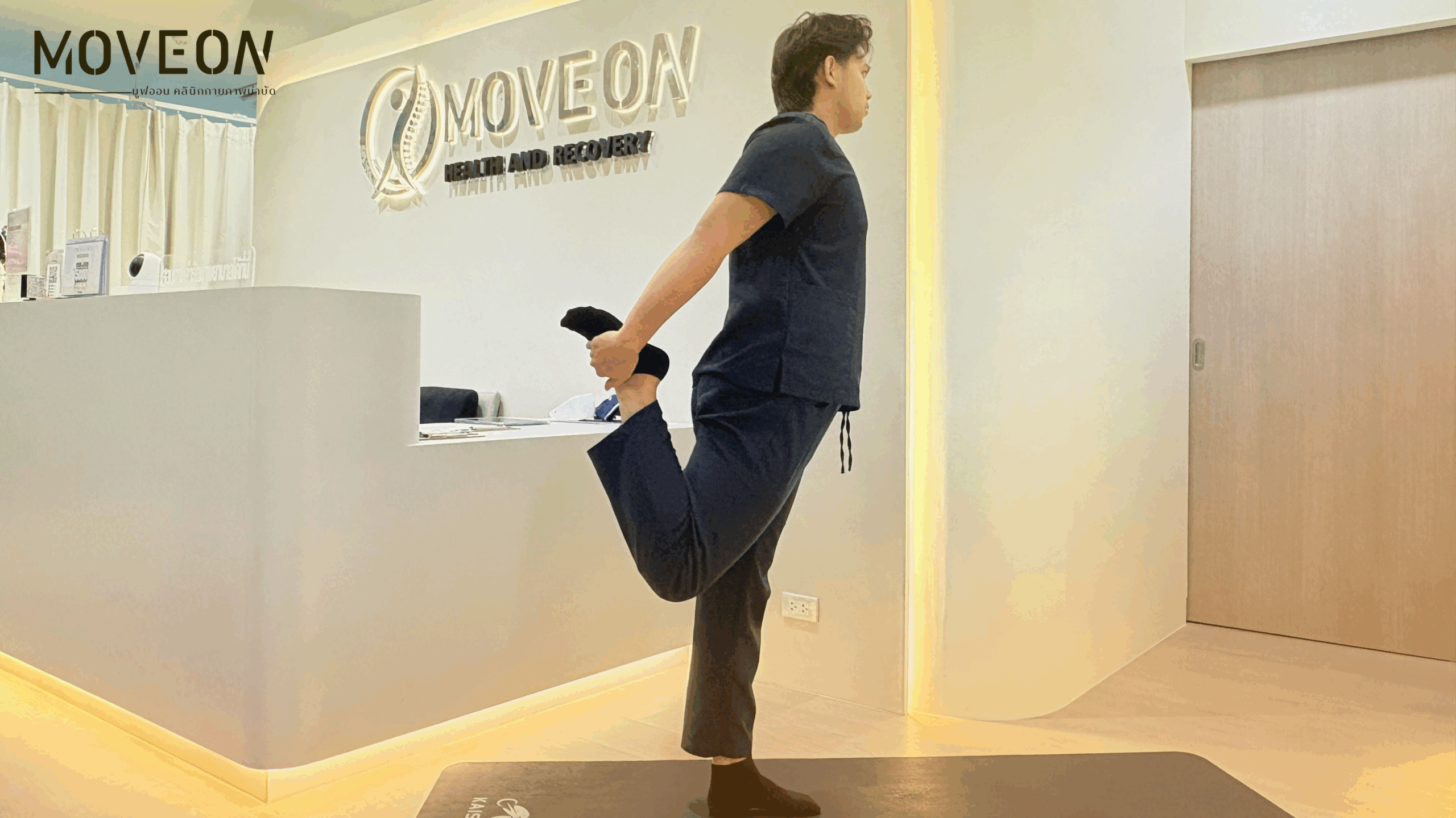 - ยืนขาเดียว ใช้มือดึงข้อเท้าอีกข้างไปด้านหลัง