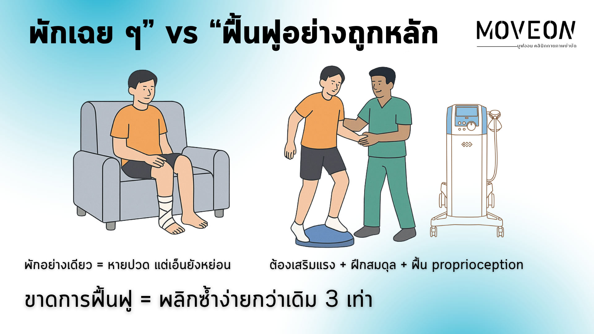 ทางกายภาพบำบัด เราพบเคสบาดเจ็บแบบนี้บ่อยครั้ง ทั้งนักฟุตบอลที่กลับมาซ้อมเร็วเกินไปแล้วพลิกซ้ำ