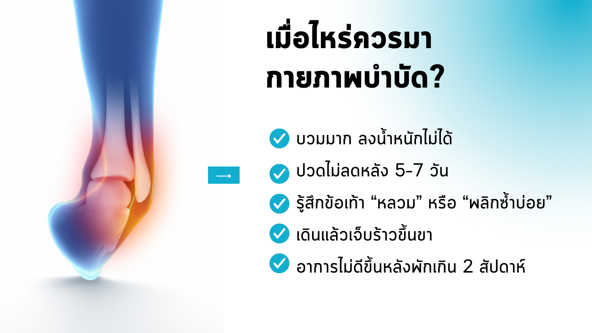 ทั้งหมดคือสัญญาณว่า “ข้อเท้ายังไม่หายสนิท” และจำเป็นต้องเริ่ม โปรแกรมกายภาพบำบัดเฉพาะบุคคล เพื่อป้องกันการบาดเจ็บซ้ำ