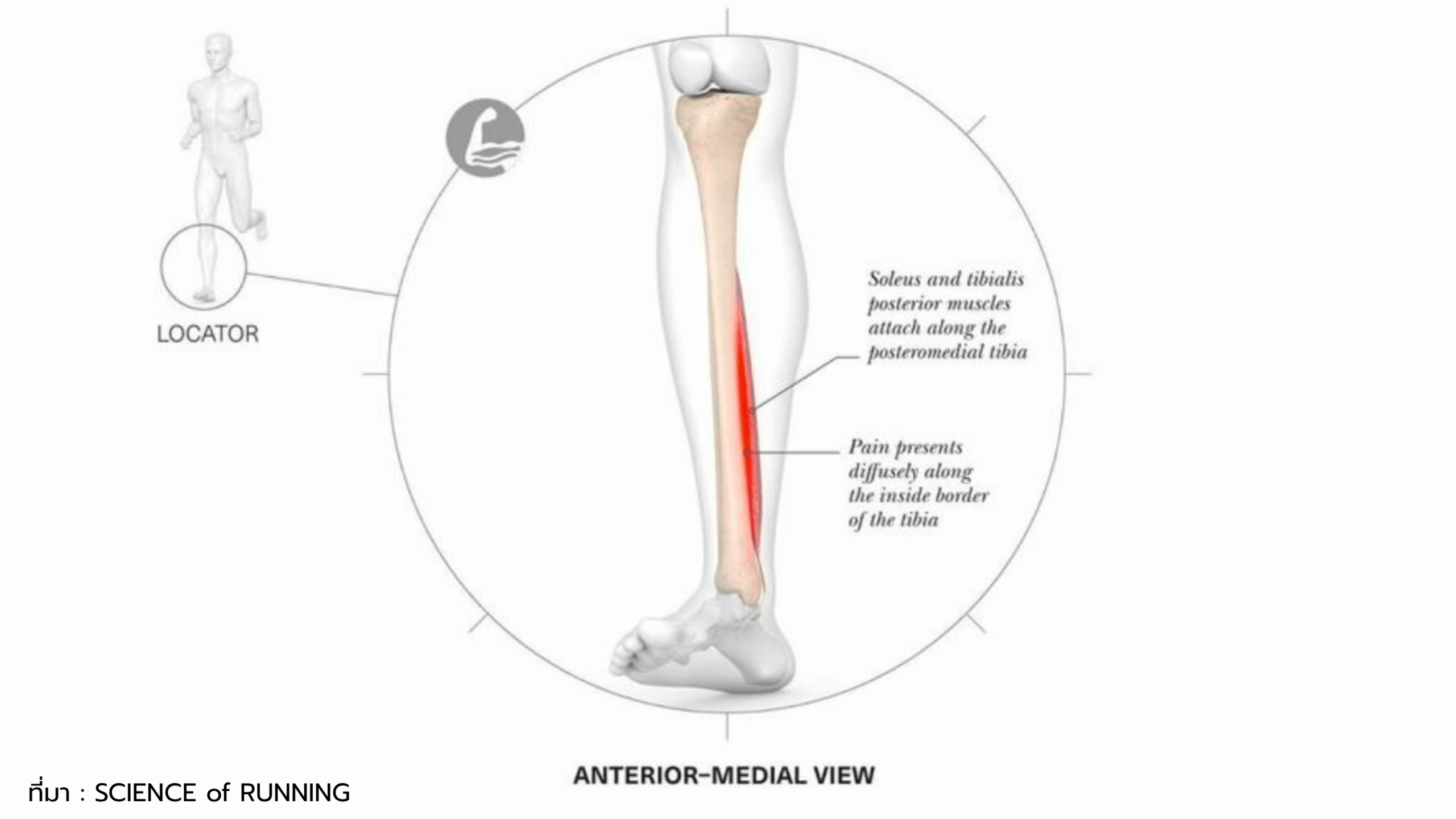 - ลักษณะอาการ: ปวดหน้าแข้งด้านใน โดยเฉพาะเวลาวิ่งหรือกดบริเวณกระดูกหน้าแข้ง
