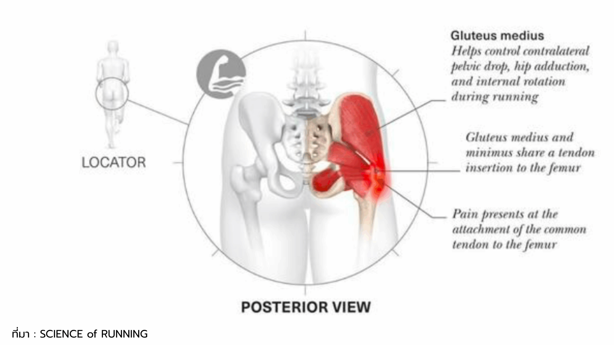 - ผลต่อเข่า: กล้ามเนื้อ Gluteus medius และ Gluteus minimus ทำหน้าที่คุมแนวกระดูกเชิงกรานและเข่า หากเอ็นสะโพกอักเสบ → เข่าจะรับแรงไม่สมดุล เกิดอาการปวดด้านใน/ด้านนอกเข่าได้ง่าย
