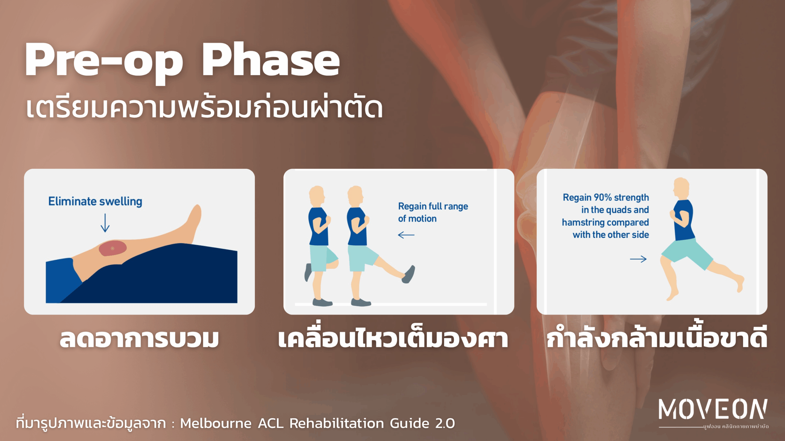 ทีมกายภาพบำบัดของ Move On Clinic จึงออกแบบโปรแกรมฟื้นฟูเอ็นไขว้หน้าโดยยึดแนวทาง Melbourne ACL Rehabilitation Guide 2.0 ซึ่งใช้ หลักการวัดผลจริง (Objective criteria) เช่น
